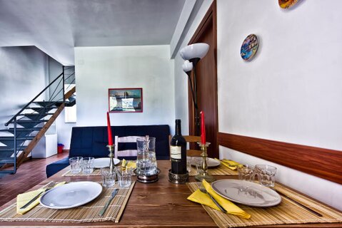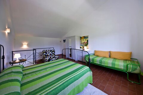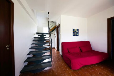 Dal soggiorno una comoda scala porta alla zona letto con armadio/guardaroba, il letto matrimoniale king size, un letto singolo e/o una poltrona letto.