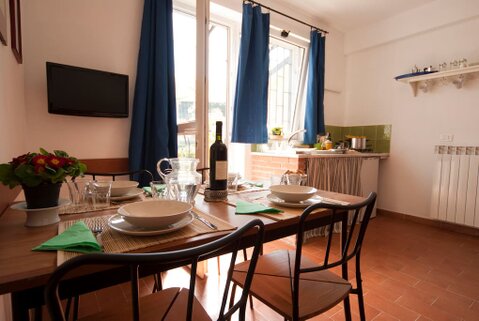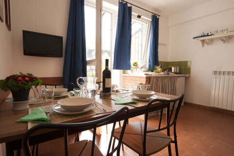 Nell’entrata/soggiorno c’è la Kitchenette con frigo, tavolo, sedie e un divano letto matrimoniale (cm 140 di larghezza).